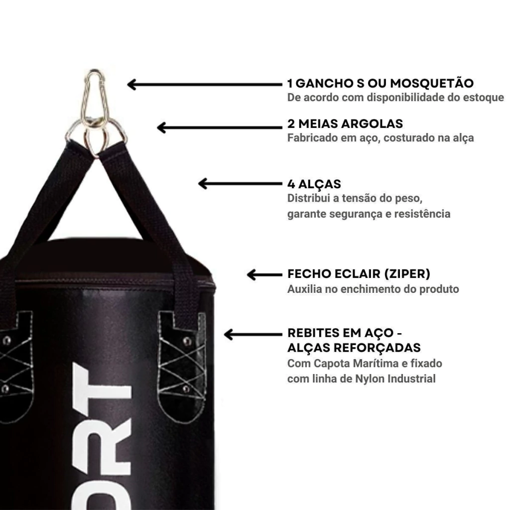• O saco de pancada possui 04 pontas de apoio, permite que o peso seja distribuído igualmente nas alças evitando que algum lado fique sobrecarregado e se rompa.